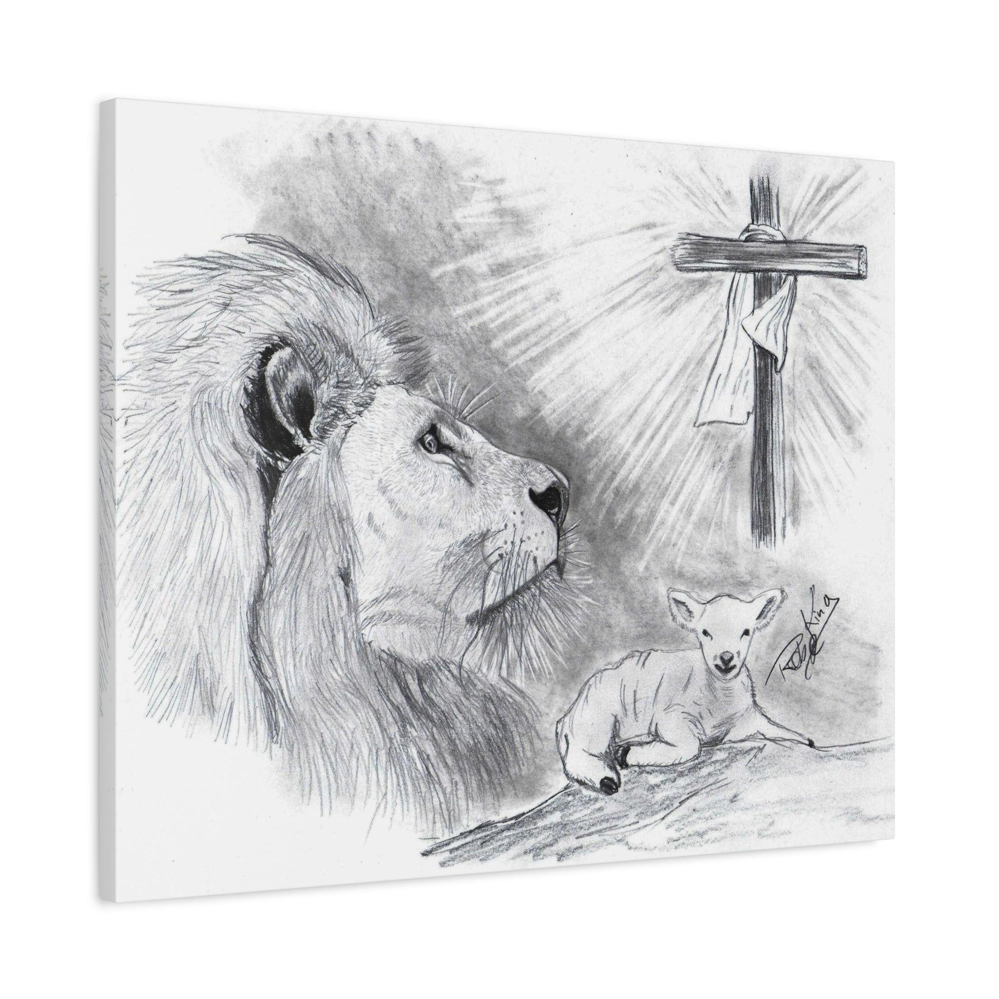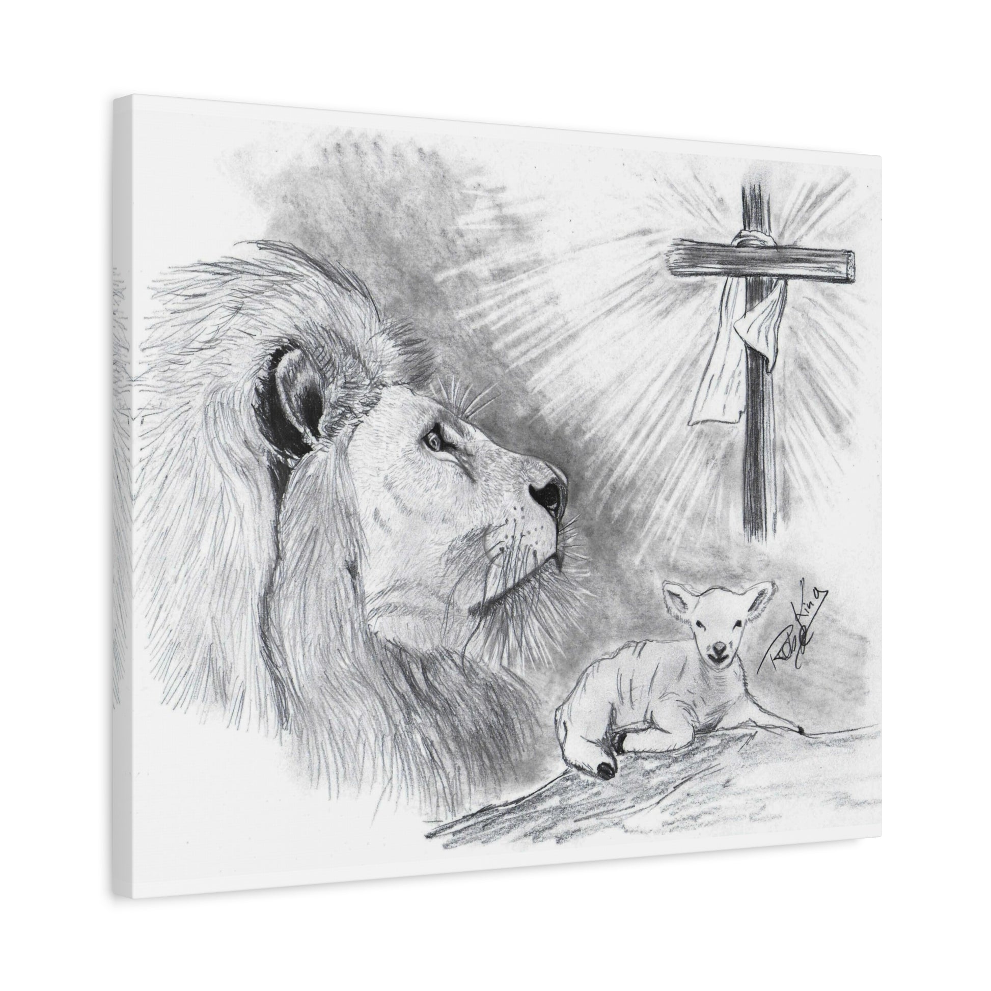 This stirring black-and-white canvas illustration, titled “Lion and the Lamb,” beautifully captures the essence of Christ's dual nature—strength and sacrifice. Hand-drawn with reverent detail, a majestic lion gazes toward the radiant cross, symbolizing the power of the Lion of Judah. At his side, a peaceful lamb rests in stillness, representing the gentle sacrifice of Jesus, the Lamb of God.